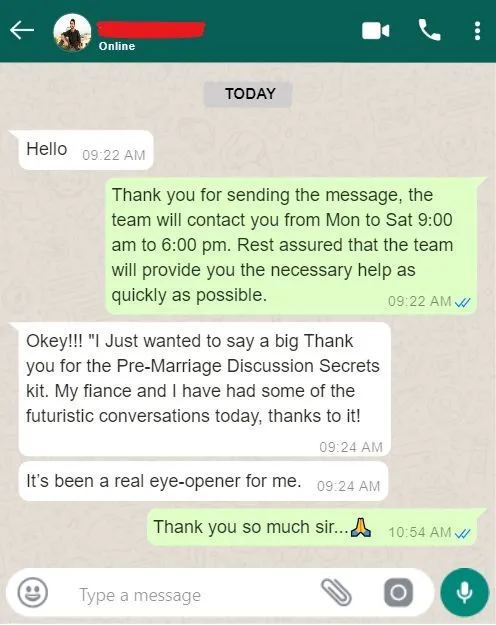 हाँ, “Ultimate Pre-Marriage Discussion Secrets” ईबुक एक है, जिसे आप ऑनलाइन खरीद सकते हैं और तुरंत एक्सेस कर सकते हैं।